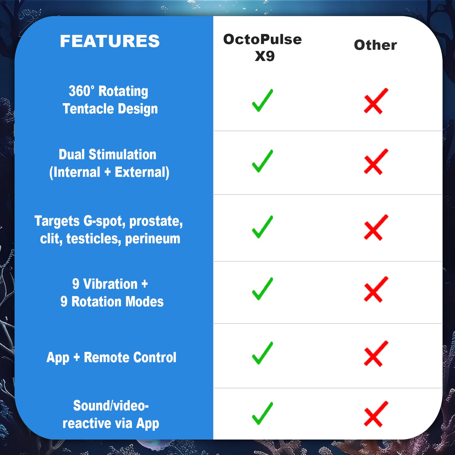 Imagine being wrapped in smooth, pulsating tentacles - twisting, thrusting, flapping in perfect rhythm with your need. OctoPulse X9 isn't just a sex toy - it's a deep pleasure revolution, designed to stimulate both internal and external hot spots for men and women.