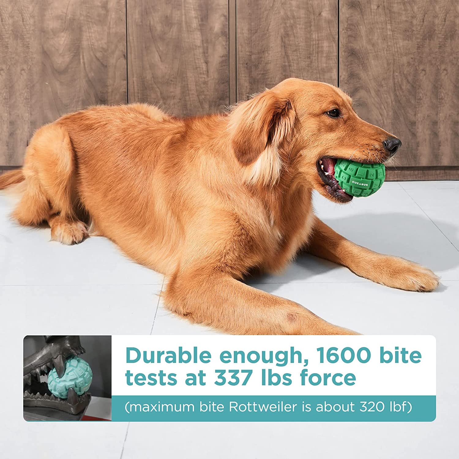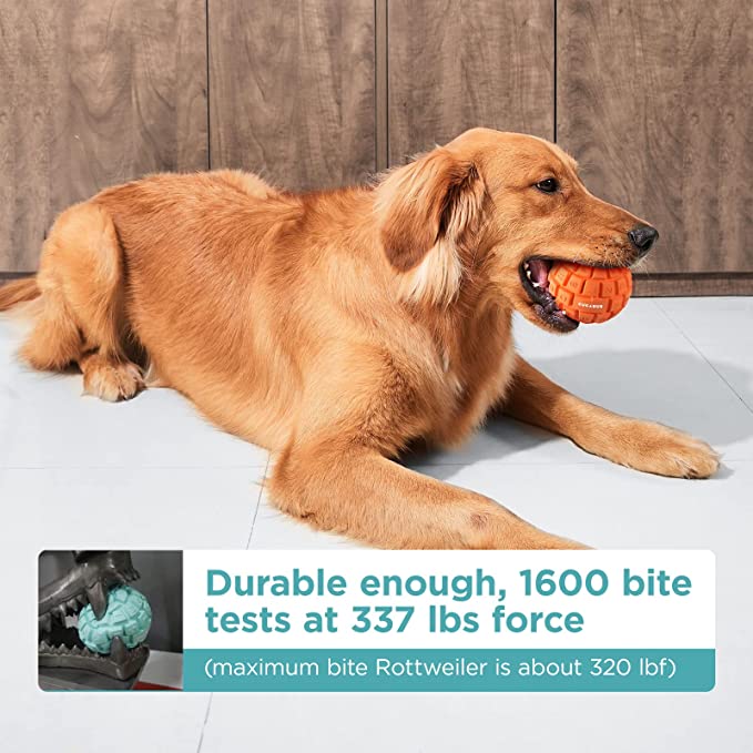Durable Dog Toy for Aggressive Chewers. Made of natural rubber. Tested for 1600+ bite tests at 337 lbf force. (Maximum bite's Rottweiler is about 320 lbf force.) Virtually indestructible.